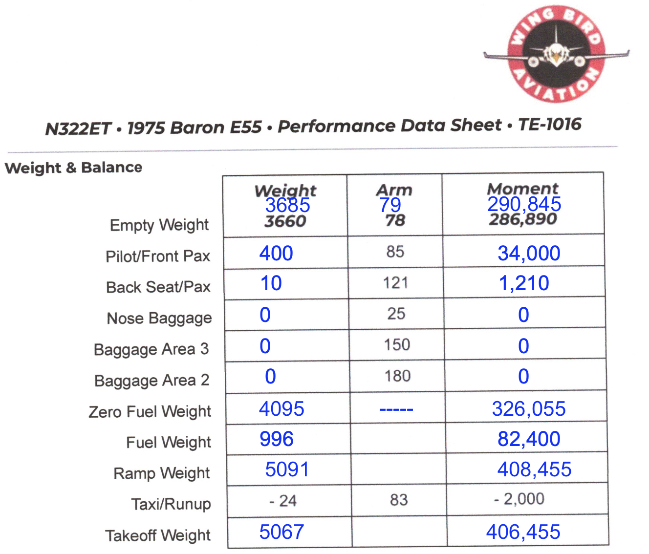 E55 Baron (N322ET) weight and balance form