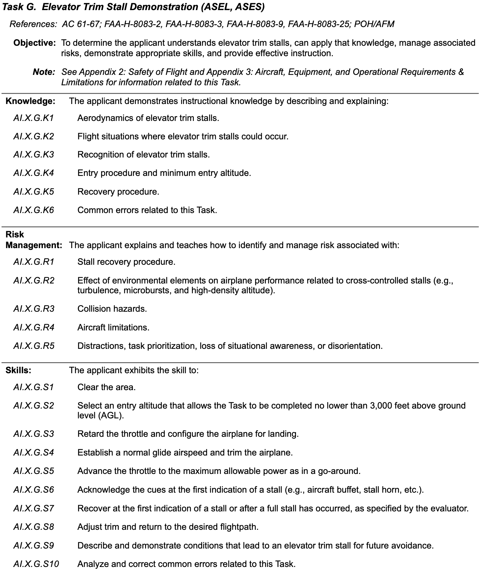 This page covers Task G. Elevator Trim Stall Demonstration from the FAA-S-ACS-25 Flight Instructor for Airplane Category Airman Certification Standards.