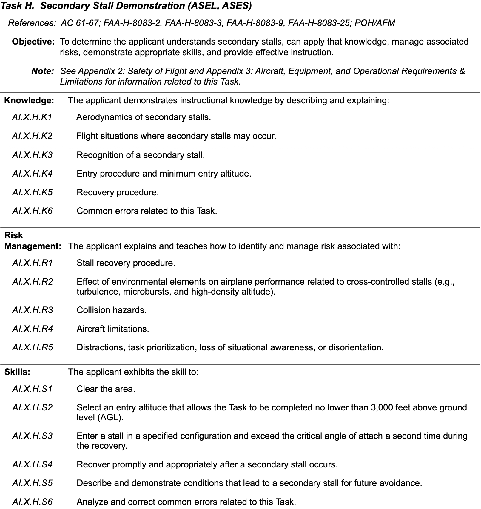 This page covers Task H. Secondary Stall Demonstration from the FAA-S-ACS-25 Flight Instructor for Airplane Category Airman Certification Standards.