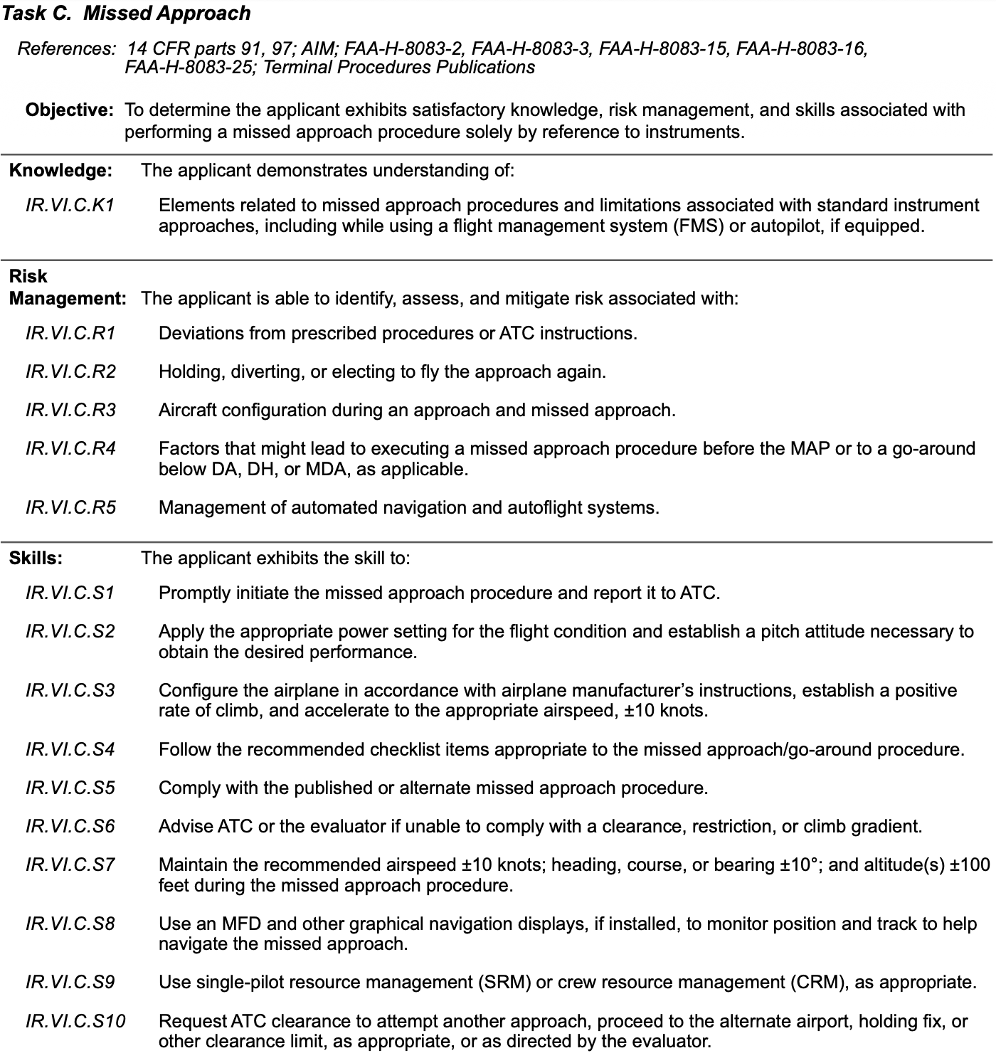 This page covers Task C. Missed Instrument Approach (PA) from the FAA-S-8081-9E Flight Instructor Instrument Practical Test Standards.
