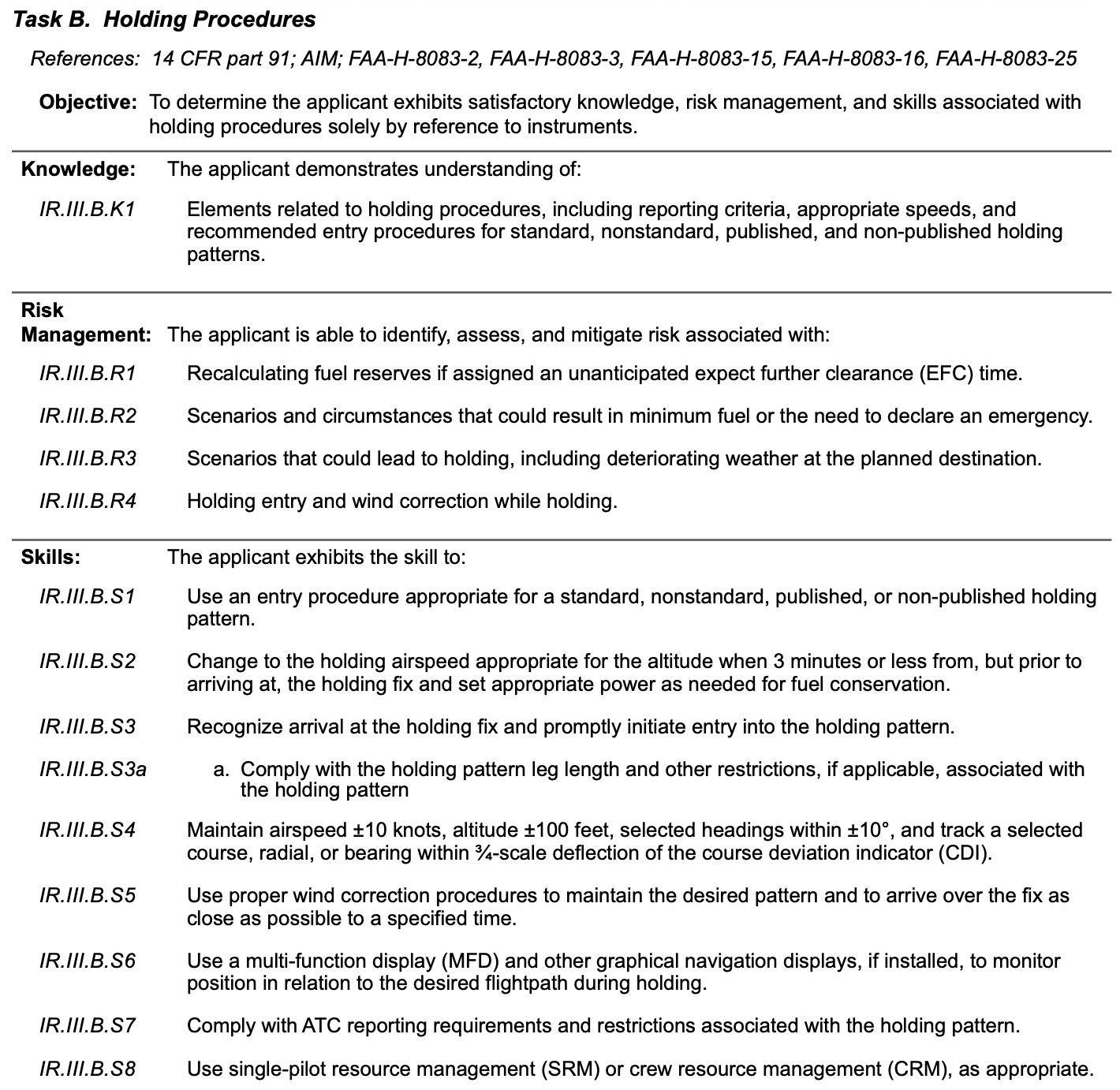 This page covers Task B. Holding Procedures from the FAA-S-8081-9E Flight Instructor Instrument Practical Test Standards.