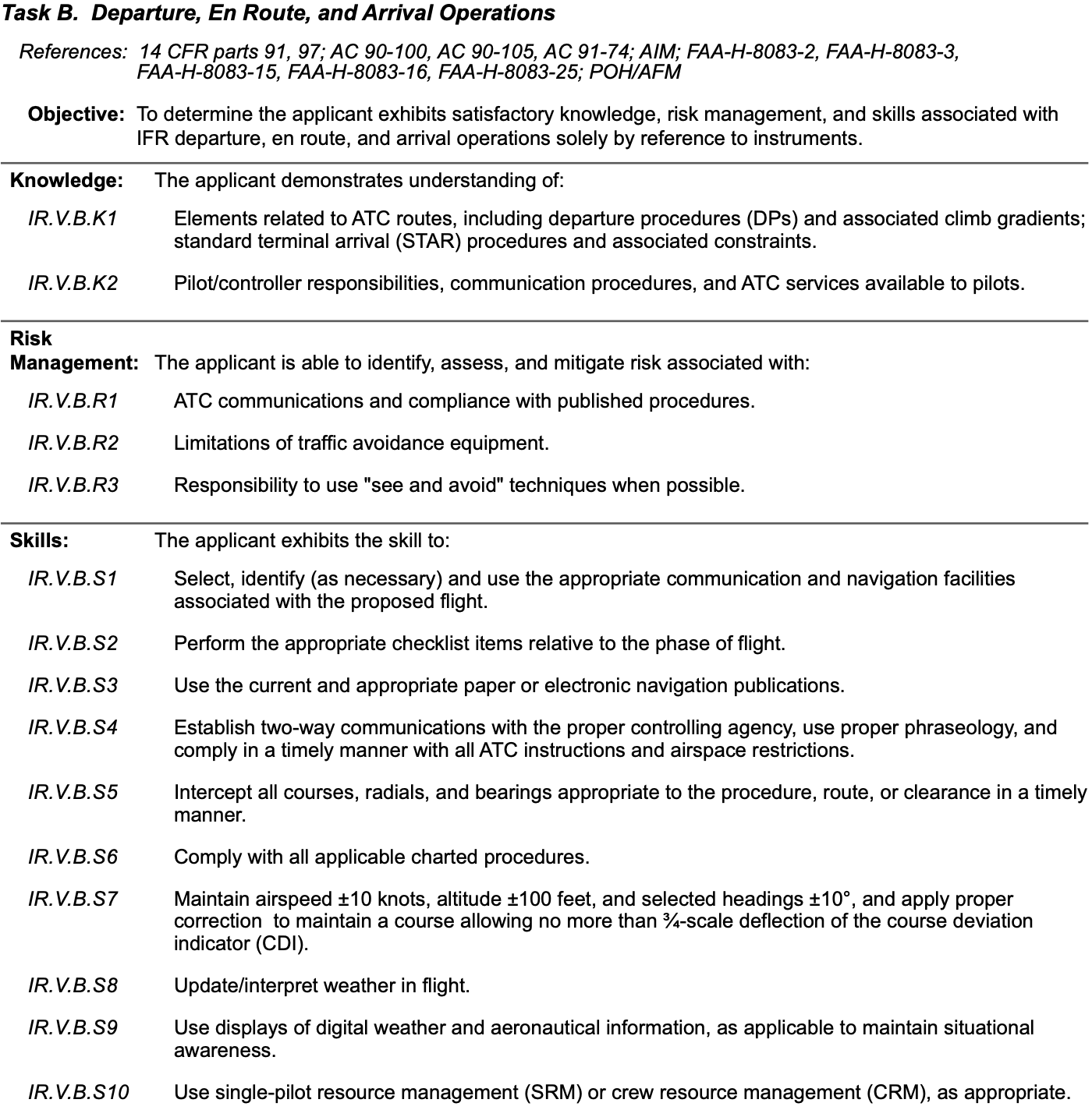 This page covers Task B. Departure, En Route, and Arrival Operations from the FAA-S-ACS-8C Instrument Rating Airplane Airman Certification Standards.